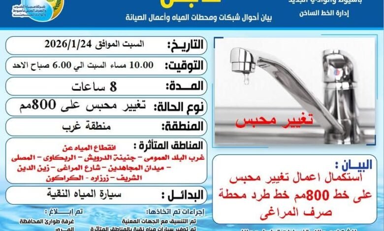 تُعلن شركة مياه الشرب والصرف الصحي بأسيوط والوادي الجديد عن إستكمال تنفيذ أعمال صيانة طارئة بتغيير محبس قطر 800 مم على خط طرد محطة صرف المراغي، ضمن خطة الإحلال والتجديد، *وتؤدي هذه الأعمال إلى انقطاع مؤقت للمياه لمدة 8 ساعات، وذلك من الساعة 10 مساء السبت 24 يناير 2026م وحتى الساعة 6 صباح الأحد 25 يناير 2026م*