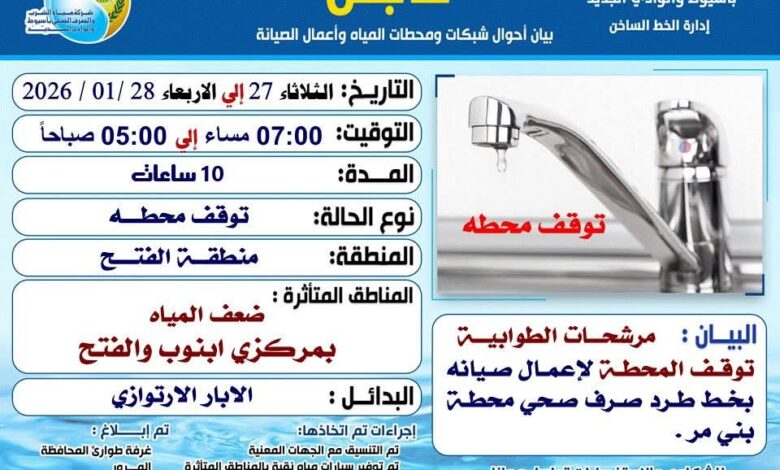 تُعلن شركة مياه الشرب والصرف الصحي بأسيوط عن استكمال تنفيذ أعمال صيانة عاجلة بخط طرد الصرف الصحي بمحطة بني مر، والمربوط بخط الصرف الصحي المتجه إلى محطة المعالجة، وذلك ضمن خطة الصيانة الدورية التي تهدف إلى الحفاظ على كفاءة واستدامة منظومة الصرف الصحي. ومن المقرر أن تستغرق الأعمال نحو 10 ساعات، تبدأ في تمام الساعة السابعة مساءً من يوم الثلاثاء الموافق 27 يناير 2026م، وحتى الساعة الخامسة صباح يوم الأربعاء الموافق 28 يناير 2026م، الأمر الذي يستلزم توقف محطة مرشحات الطوابية خلال فترة التنفيذ.