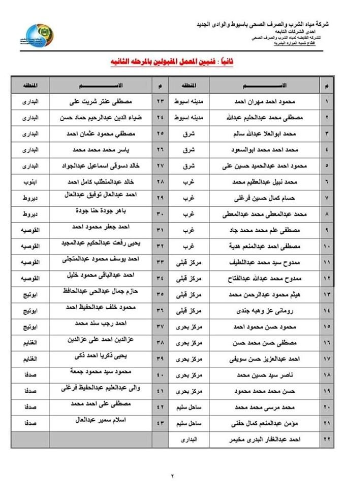 تعلن شركة مياه الشرب والصرف الصحى باسيوط والوادى الجديد عن أسماء المقبولين بالمرحلة الثانية للعمل بالشركة بوظيفة ( كيميائى،فنى معمل) فى المسابقة رقم (2) لعام 2019م بقائمة الانتظارعن هذه المسابقة ، وذلك فى ضوء ترتيب الدرجات الحاصلين عليها على مدار جميع مراحل المسابقة .