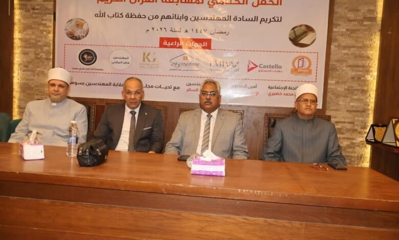 ونقل نائب المحافظ تحيات محافظ سوهاج وتقديره لكافة القائمين على تنظيم المسابقة، مشيدًا بدور نقابة المهندسين في دعم الأنشطة الثقافية والدينية، وحرصها على تنمية الوعي الديني لدى النشء والشباب، وتشجيعهم على حفظ كتاب الله وإتقان تلاوته، بما يسهم في بناء الإنسان وتعزيز القيم الأخلاقية والدينية.