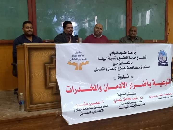تواصلت فعاليات الندوات التوعوية بأضرار المخدرات و الادمان بجامعة جنوب الوادي تحت رعاية الدكتور يوسف غرباوي رئيس الجامعة و الدكتور احمد كمال نصاري نائب رئيس الجامعة لشئون خدمة المجتمع وتنمية البيئة وبالتعاون مع صندوق مكافحة وعلاج الادمان و التعاطي و استضافت كلية الطب البيطري ندوة توعية عن مخاطر الادمان و التعاطي بإشراف