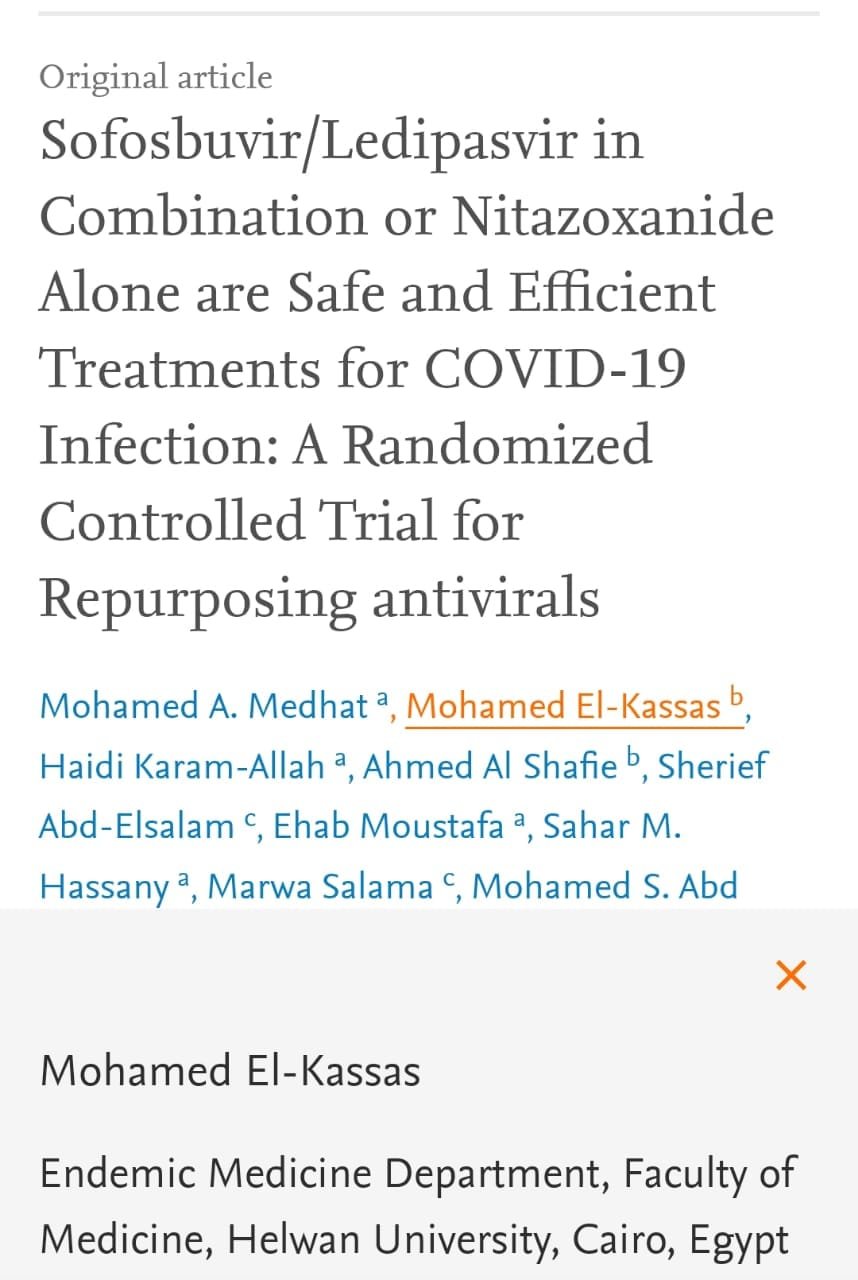 وقد اثبتت الدراسة ان المرضى الذين يتناولون عقار سوفوسبوفير/ليديباسفير و عقار نيتازوكسانيد يتعافون بشكل أسرع من غيرهم (تصبح مسحة كورونا سلبية بشكل أسرع). كما لم تسجل الدراسة حدوث مضاعفات من استخدام هذه العقاقير أثناء الدراسة، ويعد عقار سوفوسبوفير/ليديباسفير من أشهر العقاقير المستخدمة كعلاج لفيروس سي و التي تتمتع بفعالية و معدل أمان عالي، كما يستخدم عقار نيتازوكسانيد كعلاج للطفيليات و يستخدم كذلك كعلاج لكثير من الأمراض الفيروسية مثل الانفلونزا والمتلازمة التنفسية الحادة الوخيمة ومتلازمة الشرق الأوسط التنفسية و غيرهم.