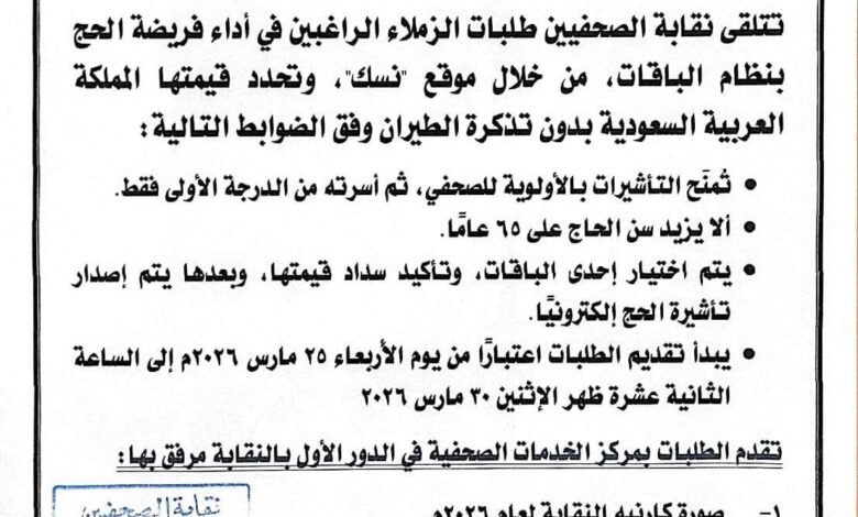 أعلنت نقابة الصحفيين المصرية بدء استقبال طلبات الزملاء الراغبين في أداء فريضة الحج بنظام الباقات عبر موقع “نسك” مع تحديد قيمة الباقات وفق المملكة العربية السعودية بدون تذاكر الطيران في إطار تنظيم عملية منح التأشيرات بكفاءة وسرعة