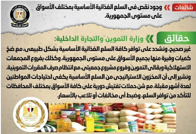 تداولت بعض وسائل الإعلام والمواقع الإلكترونية وصفحات التواصل الاجتماعي أنباء بشأن وجود نقص في السلع الغذائية الأساسية بمختلف الأسواق على مستوى الجمهورية، وقد قام المركز الإعلامي لمجلس الوزراء بالتواصل مع وزارة التموين والتجارة الداخلية، والتي نفت تلك الأنباء، مُؤكدةً أنه لا صحة لوجود نقص في السلع الغذائية الأساسية بأي من الأسواق على مستوى الجمهورية، مُشددةً على توافر كافة السلع الغذائية الأساسية بشكل طبيعي، مع ضخ كميات وفيرة منها بجميع الأسواق على مستوى الجمهورية، وكذلك  بفروع المجمعات الاستهلاكية وبقالي التموين وفروع مشروع جمعيتي، مع انتظام صرف المقررات التموينية، مُشيرةً إلى أن المخزون الاستراتيجي من السلع الأساسية يكفي احتياجات المواطنين لعدة أشهر مقبلة، مع شن حملات تفتيش دورية على كافة الأسواق بمختلف المحافظات للتأكد من توافر السلع، وضبط أي مخالفات أو تلاعب بالأسعار.