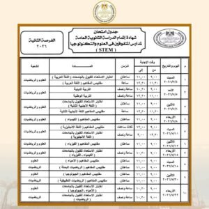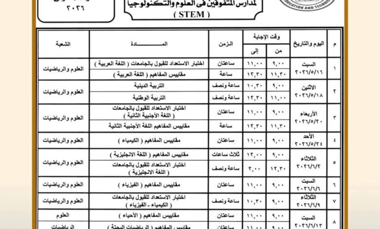 كما تبدأ امتحانات شهادة إتمام الثانوية العامة بمدارس المتفوقين في العلوم والتكنولوجيا “STEM” (الفرصة الأولى) يوم 16 مايو 2026 وتنتهي يوم 20 يونيو 2026، وتبدأ امتحانات (الفرصة الثانية) يوم السبت 4 يوليو 2026 وتنتهي يوم 22 يوليو 2026.