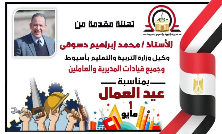 قدم محمد ابراهيم دسوقى وكيل وزارة التربية والتعليم بأسيوط ،خالص التهانى وأطيب التمنيات للسيد محمد عبد اللطيف وزير التربية والتعليم والتعليم الفنى ولواء محمد علوان محافظ أسيوط وجميع القيادات التنفيذية وجموع المعلمين بالمحافظة بمناسبـة الاحتفال بعيد العمال ، والذى تحتفل به الدولة في الأول من مايو كل عام، متمنياً دوام التوفيق والسداد ولمصرنا الغالية الاستقرار والأمان والخير والسلام .