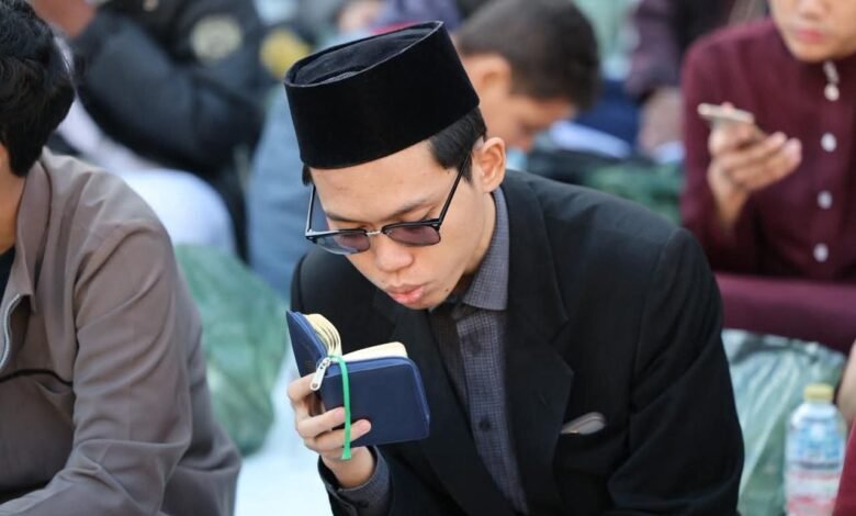 يتلون كتاب الله ويتدارسونه .. الطلاب الوافدون كالبنيان المرصوص بصحن الجامع الأزهر قبيل الإفطار الجماعي الذي ينظمه بيت الزكاة والصدقات