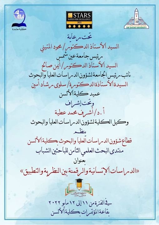 ١١ مايو منتدى شباب الباحثين بألسن عين شمس بعنوان “الدراسات الانسانية والرقمنة بين النظرية والتطبيق”