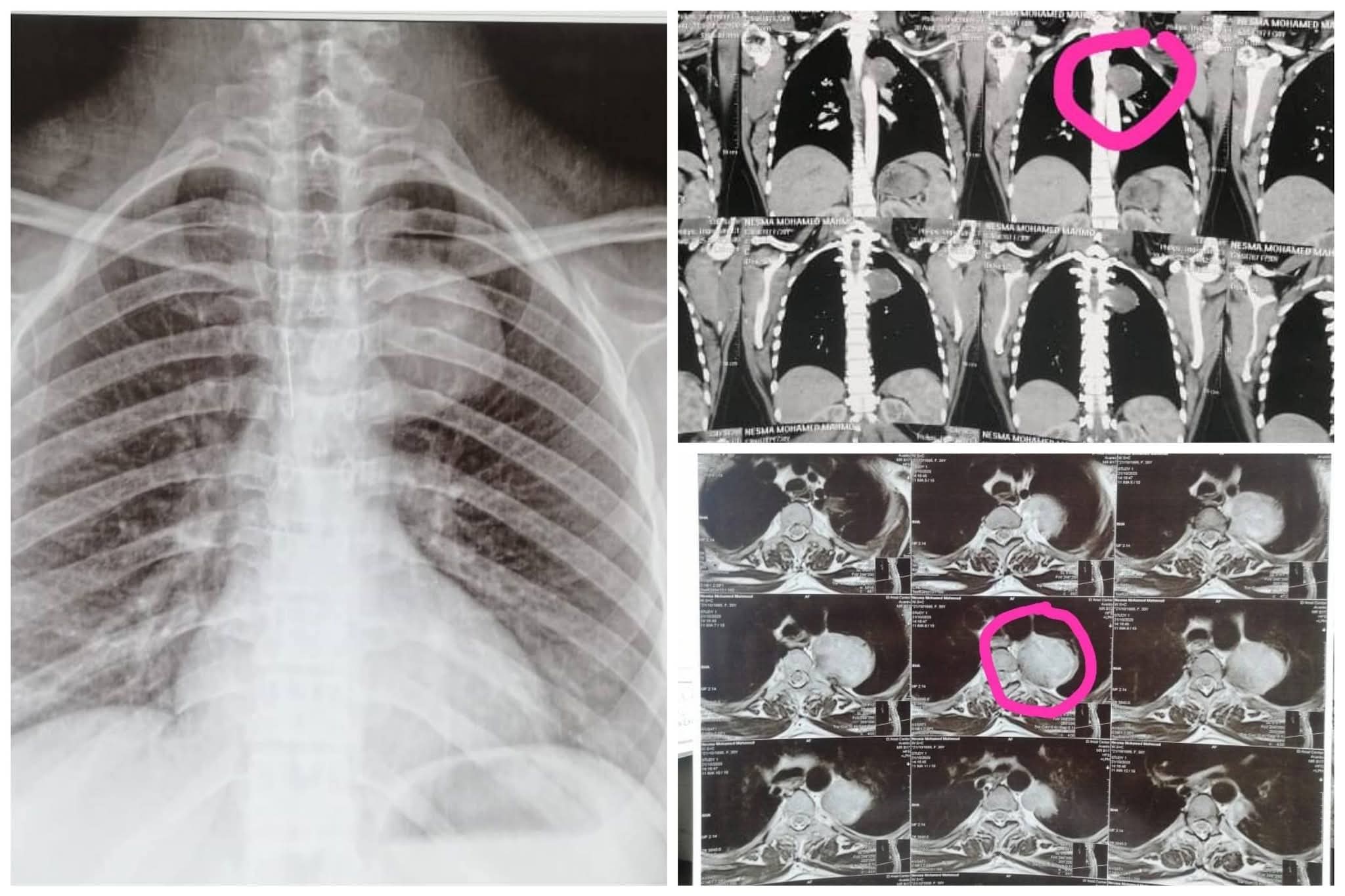 كان مستشفى الأمراض العصبية والنفسية وجراحة المخ والأعصاب برئاسة الأستاذ الدكتور طارق راجح، قد استقبل سيدة تبلغ من العمر ٢٥ عاما، حامل في شهرها الأول، وتعاني من إلتهابات رئوية متكررة، وبعد فحصها من قبل فريق من المتخصصين #بقسم_الأمراض_الصدرية، تحت إشراف الأستاذة الدكتورة صفاء وافي، وضم الدكتورة صفاء عبد الجيد، استشاري الأمراض الصدرية، والطبيب يوسف ثروت، طبيب مقيم بالقسم، بمشاركة الطبيبة شروق كيلاني، مدرس مساعد بقسم طب القلب، أظهرت الأشعات وجود ورم معقد بالعمود الفقري ممتد إلى الرئة.