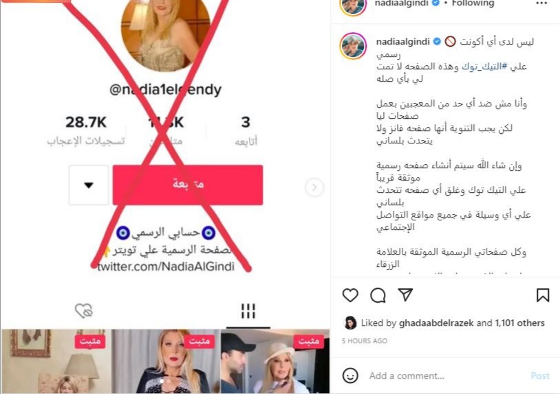 وأضافت نادية الجندى: "سأقوم بغلق أى صفحة تتحدث بلسانى على أى وسيلة في جميع مواقع التواصل الاجتماعي وكل صفحاتي الرسمية الموثقة بالعلامة الزرقاء، سواء على الفيس بوك والإنستجرام وتويتر، هما دول الأكونتات الرسمية التي تخصني فقط وشكراً".