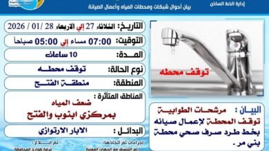 مياه أسيوط: ضعف مؤقت في ضغط المياه بمركزي أبنوب والفتح بسبب أعمال صيانة طارئة وتشغيل البدائل