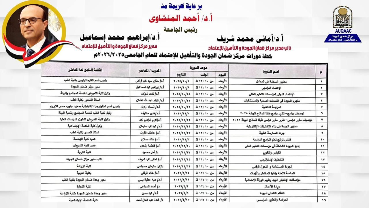 تحت رعاية الدكتور أحمد المنشاوي، رئيس جامعة أسيوط، شهدت الجامعة اليوم الخميس الموافق 25 سبتمبر انطلاق الفعالية التدريبية الأولى لمبادرة "بداية جديدة لضمان جودة التعليم ...