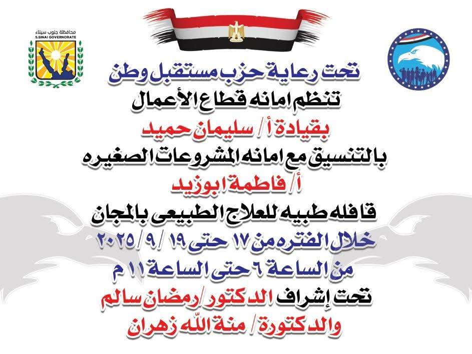 اختتمت بمدينة طور سيناء فعاليات القافلة الطبية المجانية للعلاج الطبيعي التي نظمها حزب «مستقبل وطن» برعاية أمانة قطاع الأعمال بقيادة سليمان حميد وبالتنسيق مع أمانة المشروعات الصغيرة برئاسة فاطمة أبوزيد، وذلك بمركز الريان للعلاج الطبيعي بمركز شباب المنشية.