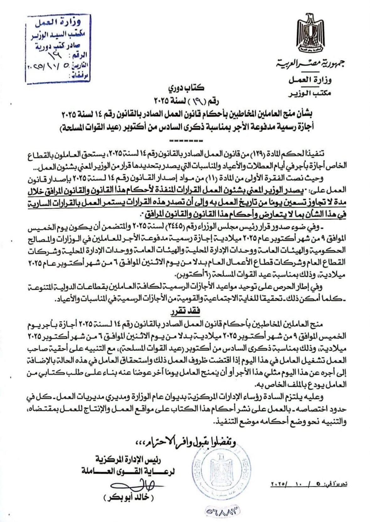 وزير العمل يعلن الخميس 9 أكتوبر إجازة رسمية مدفوعة الأجر للقطاع الخاص بمناسبة ذكرى السادس من أكتوبر