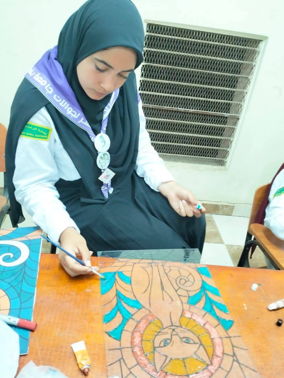 وتهدف الدورة لتنمية وصقل مهارات الجوالات من خلال التدريب على مهارات الرسم علي الزجاج واشغال الإبرة وتدوير مخالفات البيئة وأعمال الحبال والرسم علي الجلد